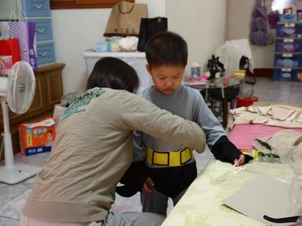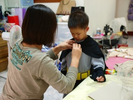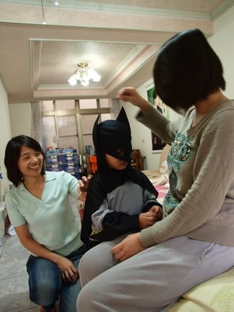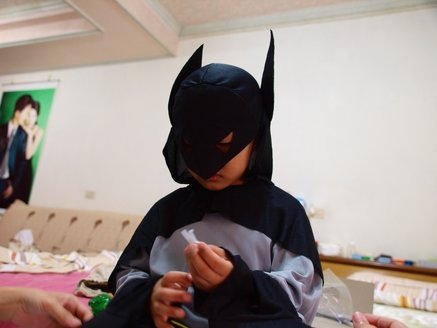 雖然心情不好,但是寶貝還是拿來萬聖節他準備展示給同學看的蝙蝠俠造型裝,準備著裝讓我先睹為快囉!