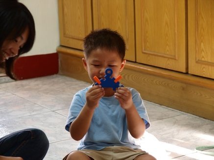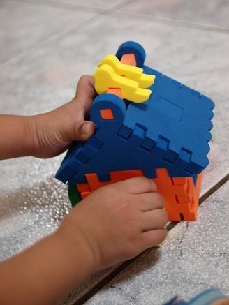寶貝終於心情好時可興奮的很呢!到處蹦蹦跳跳,手上這個正在拼裝的房子積木可花了不少時間才完成,之前呈現的完全是分屍狀態