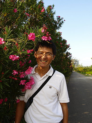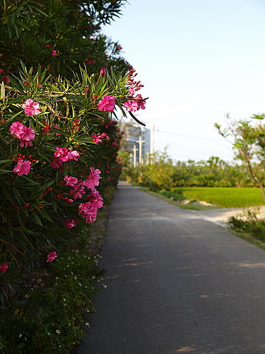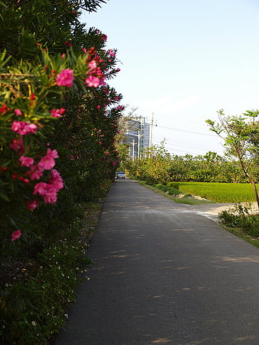 因為進到港南原來是得收費的啊!所以完全沒停留我們就直接轉彎往漁港方向,隨意轉入的小路,沿路邊有令人驚豔的紅花陪襯,花香陣陣