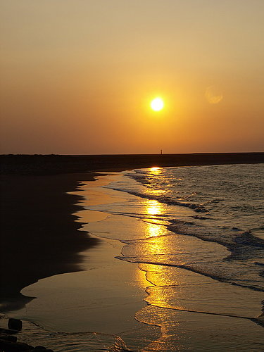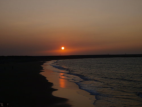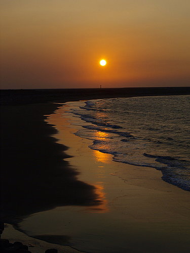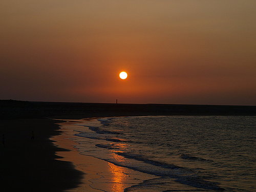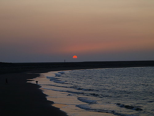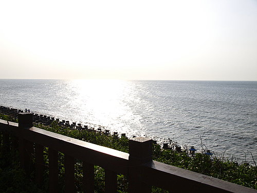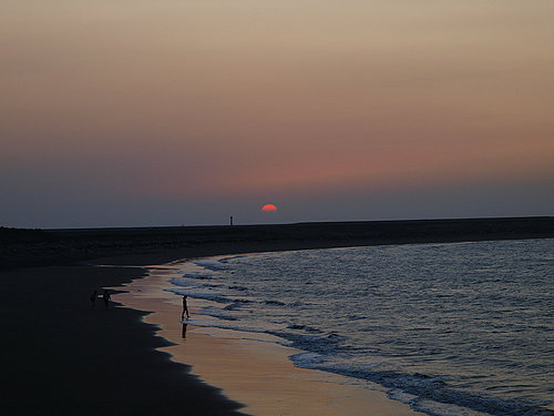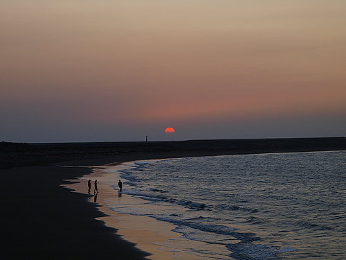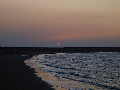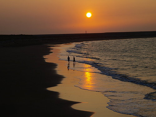 遠遠的,望見兩人在落日餘暉下漫步著,是一種浪漫,想必是一對戀人吧!