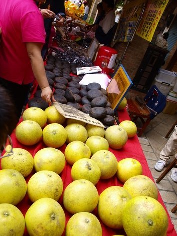 這個東西叫柚子茶,據說潤喉很神奇,把一大顆的柚子挖空,在裡面塞茶葉然後再乾燥,聞起來有柚香混著茶香,雖然很吸引我,但是老公在一旁說,依照我過往的經驗,我買了也不會吃,老公都這麼說了,所以只好作罷啦!