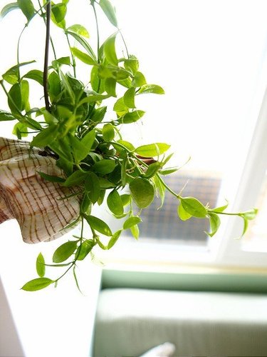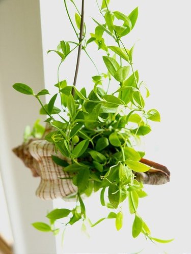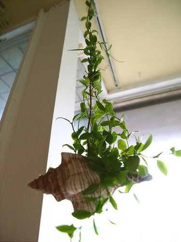 過了幾天我又忍不住添購了這盆植物,名叫愛元果,但是老闆剛說的時候我心裡以為是愛圓果(我比較喜歡這個名字,有圓滿的感覺),吸引我目光的就是她是用貝殼來當盆器,也是垂掛式的,讓我覺得很新鮮,特地問了老闆該怎麼養才好,就怕又不小心養死了,老闆說這植物不需常澆水,但如果要澆水就要一次給個夠,直接泡在水裡1020分鐘即可,我又想:以我不是很勤勞的個性來說,我應該可以養的活吧!不過這盆比較貴,要200,所以我還特地打電話給老公徵詢他的意見,得到的反應當然是OK囉!我想老公也很喜歡家裡有點植物,有綠意的情調吧!