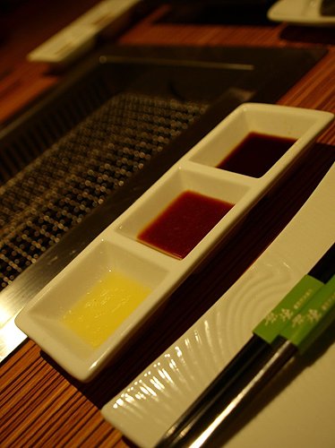 烤肉的三種沾醬 由左至右分別是檸檬汁、味磳醬、清醬油
