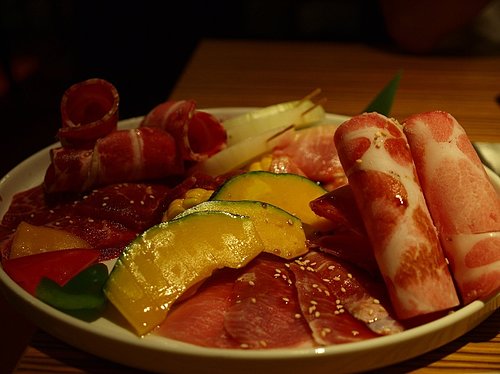 牛肉和豬肉的拼盤裝在一起 各有三種不同的肉 我們依照服務員的示範只在肉上灑了些岩鹽就下去烤