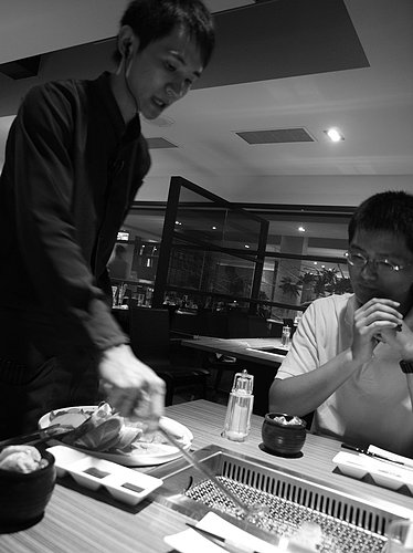 服務員示範解說該怎麼烤肉才會好吃