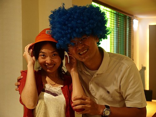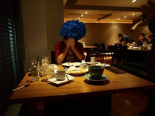 突如其來的慶生讓我整個人嚇一跳,最恐怖的是被強迫戴上那頂藍色的爆炸頭,我遮住自己的臉完全都不敢看只覺得反正我不看就好像別人也看不到我一樣,完全就是鴕鳥心態