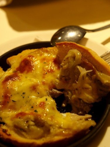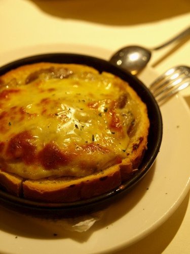 我點的前菜--焗烤磨菇加方塊麵包(因為不能吃牛肉,所以只能點這個,前菜的部分菜單也都沒變過)
