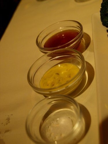 有三種配料---海鹽、黃芥末、蒜茸醬